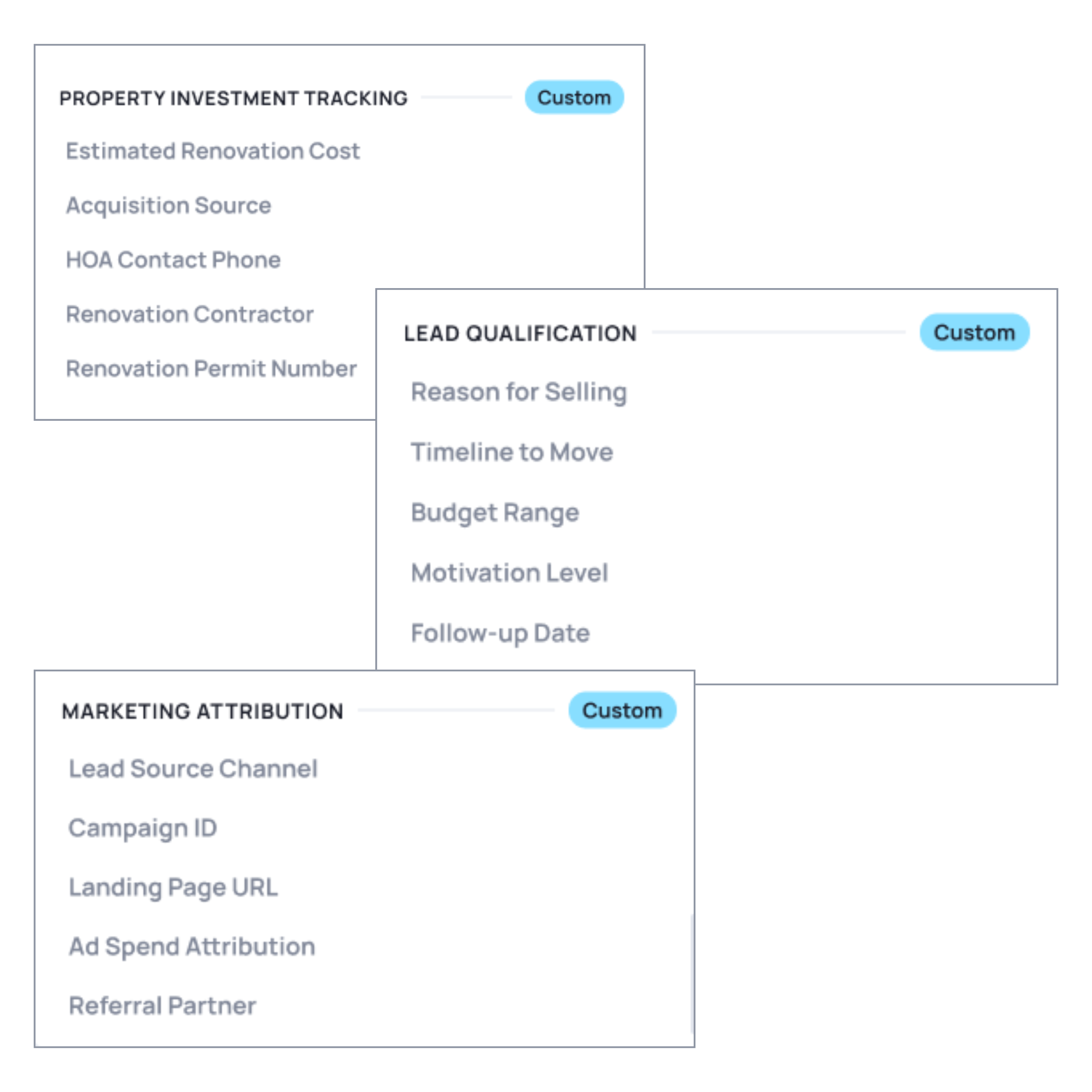 Whether you need to record a specific date (like an offer expiry), a precise number (like rehab budget), or track a specific marketing campaign source, you have a field for it. Build custom fields that flawlessly support every data point in your workflow, from high-level "Qualifying Questions" to granular "Property Renovation Costs."
